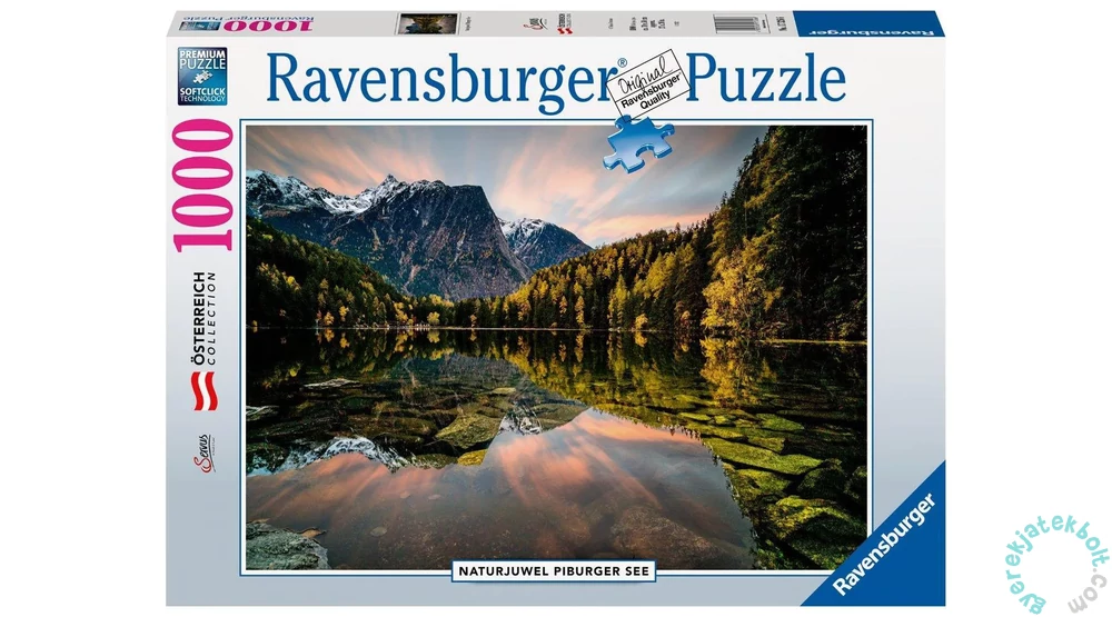 Ezen a Ravensburger 1000 db-os puzzle - Csodálatos Piburger-tó (17326) kirakón a közel 1000 méteres magasságban fekvő tó 25 fokos vízhőmérsékletével Tirol egyik legmelegebb fürdőtava látható. A tó körül terül el Tirol egyik legrégebbi természetvédelmi területe. A víztükörben kristálytisztán kirajzolódnak az Alpok csúcsai.