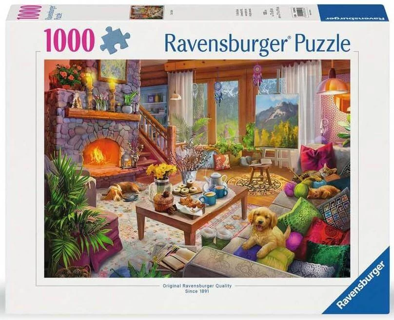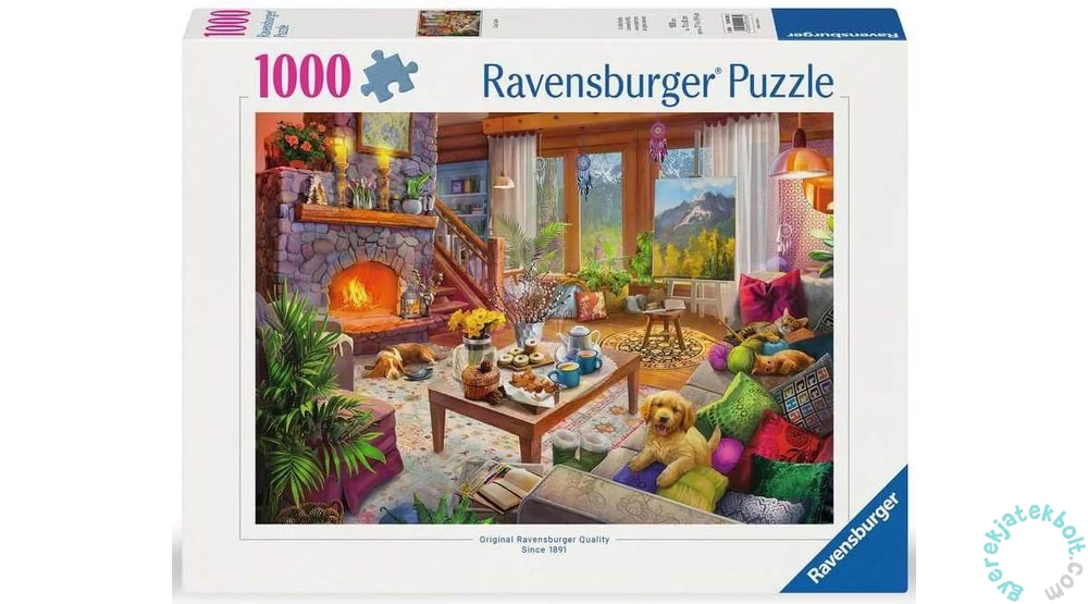 A Ravensburger 1000 db-os - Hangulatos házikó puzzle képén egy hangulatos hétvégi ház nappalijából kémlelhetjük a távoli hegyeket. A kandallóban tűz lobog, az asztalon sütemény és tea, játékos cicák és egy kis kutya várják a gazdikat.