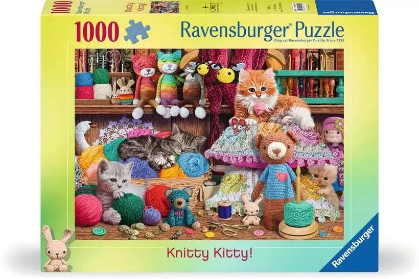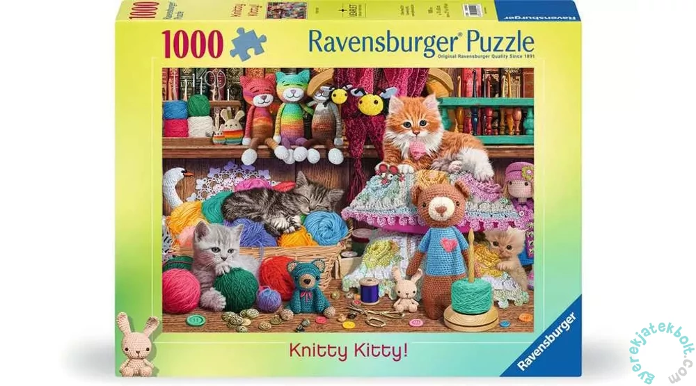 Ezen a Ravensburger 1000 db-os puzzle - Kötögetés cicákkal (12000102) kirakón cuki cicák láthatóak, amint épp a gombolyagokkal és az azokból kötött játékokkal játszanak.