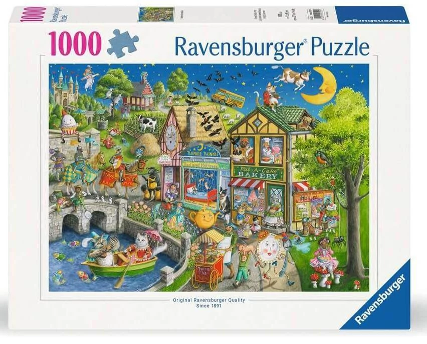 A Ravensburger Lúd Anyó meséi (12001352) kirakó az angolszász mesevilág ismert figuráit kelti életre. A varázslatos kis városkában találkozhatsz Tojás Tóbiással, egy hegedűn játszó macskával, repülő tehénnel és még sok kicsit fura, de bájos alakkal.