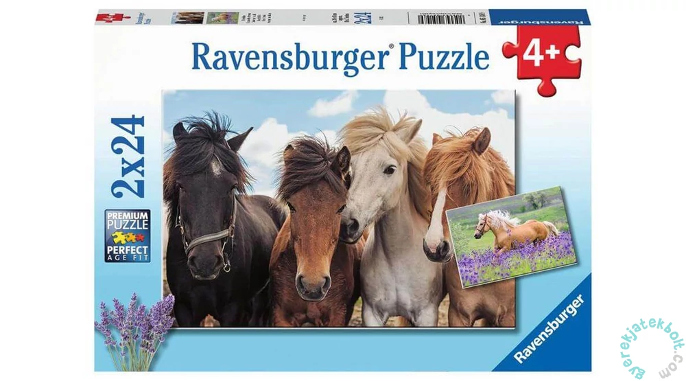 A Ravensburger 2 x 24 db-os - Lovak című kirakó mindkét képe csodás lovakat ábrázol. Az egyik képen 4 ló pózol, a másikon pedig egy levendula mezőn vágtázó paripát láthatunk.