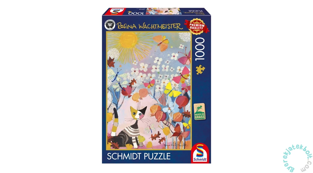 A Schmidt Striped Kitten – Rosina Wachtmeister (58658) 1000 db-os puzzle a művésznő jellegzetes macskás stílusában mutatja be a csíkos kiscica bájos és játékos világát. Az élénk színekkel és részletgazdagon megalkotott illusztráció minden egyes darabbal újabb felfedezést kínál, miközben a finom árnyalatok és geometriai minták harmonikus látványt nyújtanak. A Schmidt prémium minőségű puzzle-darabok biztosítják a pontos illeszkedést, a strapabíró kartont és a színek tartósságát, így a kirakott kép hosszú távon dekoratív faliként is használható. Az 1000 darabos puzzle ideális választás haladó puzzlezőknek és mindazoknak, akik szeretik a részletgazdag, művészi és színes alkotásokat. A Schmidt Striped Kitten puzzle tökéletes ajándék macskakedvelőknek, művészetrajongóknak, valamint mindazoknak, akik minőségi kikapcsolódásra vágynak.