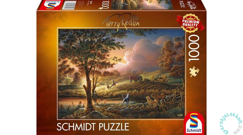 A Schmidt 1000 db-os puzzle - Sun Gold Over Tyre Fields kirakó Terry Redlin amerikai illusztrátor festményét ábrázolja. A képen egy vidám farm életébe kapunk betekintést: a gazda éppen learatja a termést, a játékos kutyák pedig a felzavart fácánokat figyelik.