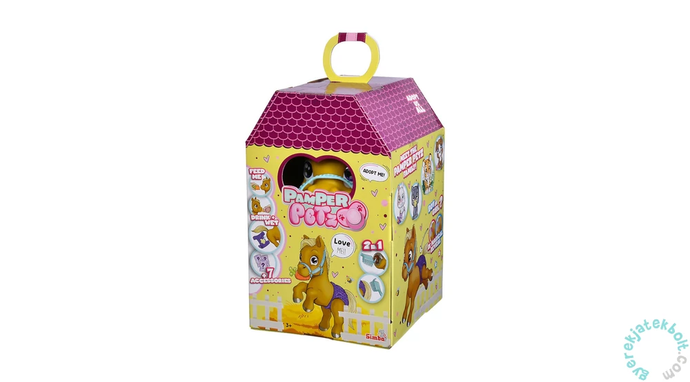 Ez a tündéri póni ló gazdit keres, aki örökbe fogadja, elnevezi és szeretettel gondoskodik róla. A szettben megtalálható egy örökbefogadási igazolás, A nagy, csillogó szemű póni még nagyon pici és pelenkát hord, amibe bele is pisil. Itasd és etesd meg, majd cseréld ki a pelenkáját! Amennyiben a pelenka nedves lesz, a belső rész sárgára változik. A varázslatos szív alakú anyajegy megmutatja, hogy a Pamper Petz pónid fiú vagy lány. Ha vízzel érinted az anyajegyet a színe kékre vagy rózsaszínre változik, ezzel tudod meg a pónid nemét. A játékszett a pónin kívül három meglepetést is tartalmaz a póni gondozásához és etetéséhez, valamint egy örökbefogadási lapot is, amit a boldog pónitulajdonosok személyre szabhatnak az állat adataival, például a jószág nevével, súlyával és nemével.