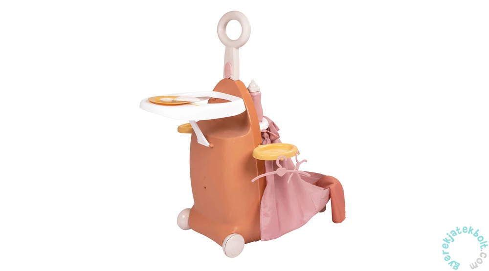 Megérkezett a legújabb szín-összeállítású, narancs színű babacenter, ami valójában egy szállítható babaszoba - benne egy fekhely és egy etetőszék található! A bőrönd (nyitott állapotában) egyik oldalán található az etetőszék kiegészítőkkel (tányér, kanál, cumisüveg), a másik oldalán pedig a kiságy baldachinnal és takaróval. Ez a gyerekjáték lehetőséget és helyszínt biztosít a kislányoknak, hogy szerepjáték közben gyakorolhassák a kisbabák gondozását. A babacenter bőrönd kerekeken gurulva könnyen húzható, így a kislányok bárhová magukkal vihetik kedvenc játékukat.