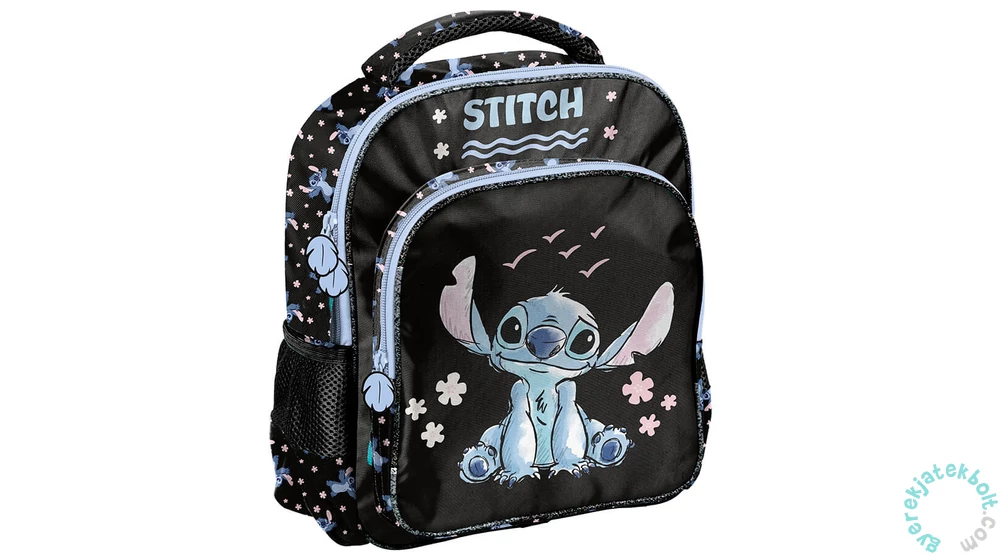 Stitch ovis hátizsák - Black (DS25GG-337) az óvodás és kisiskolás korosztály számára. Egy nagy és egy kisebb cipzáras zsebbe lehet pakolni a szükséges holmikat, mindkét oldalán kis hálós zseb található. Kézben és vállon is kényelmesen hordható, állítható vállpántja párnázott, cipzárait cuki húzóka díszíti. Stitch mintával ellátva, vidám kiegészítője a lányok ruhatárának.
