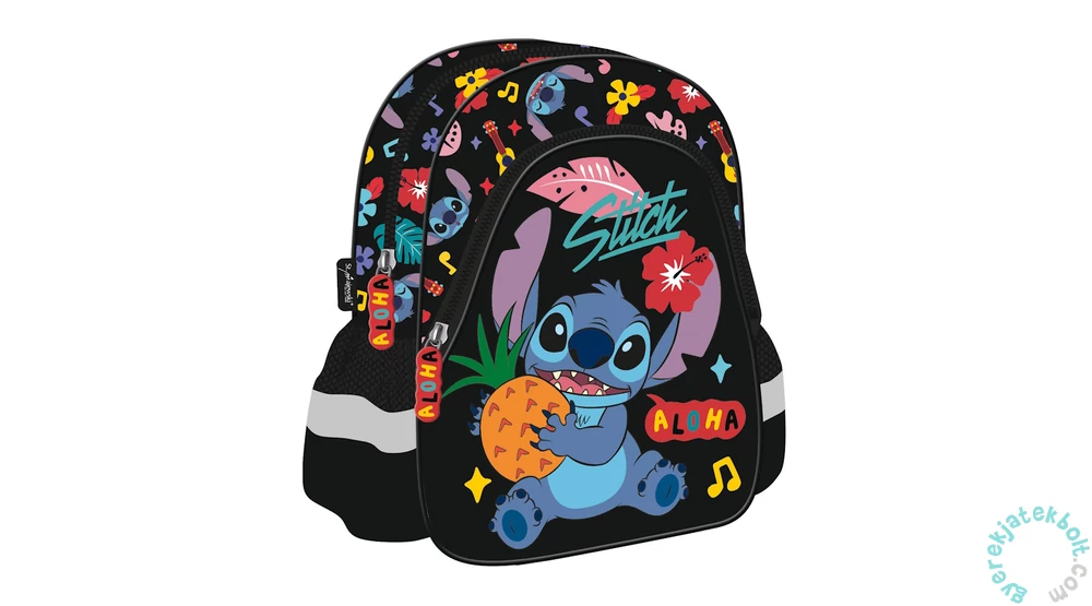 A Stitch ovis hátizsák - Stitch - Aloha (679858) a minden gyermek által jól ismert, cuki Stitch képével van díszítve, kifejezetten az óvodás és a bölcsődés korosztály számára készült. Egy nagy és egy kisebb cipzáras zsebben vihetik magukkal kedvenc játékaikat az oviba a gyerekek. Két oldalán egy-egy hálós zsebben tartható az innivaló. Kézben és vállon is kényelmesen hordható. Állítható vállpántja párnázott, kényelmes.
