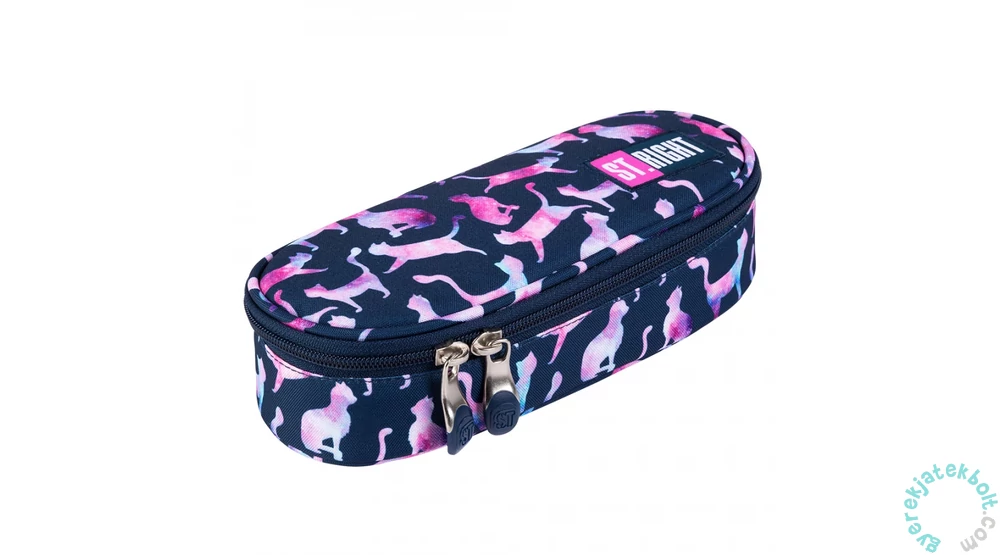 St.Right - Cicás ovális tolltartó - Cosmic Cats cica mintával, különleges színekben. Egyterű belsejében praktikus cipzáras zseb is található, így elfér benne az összes írószer, amire az iskolásoknak szüksége van.