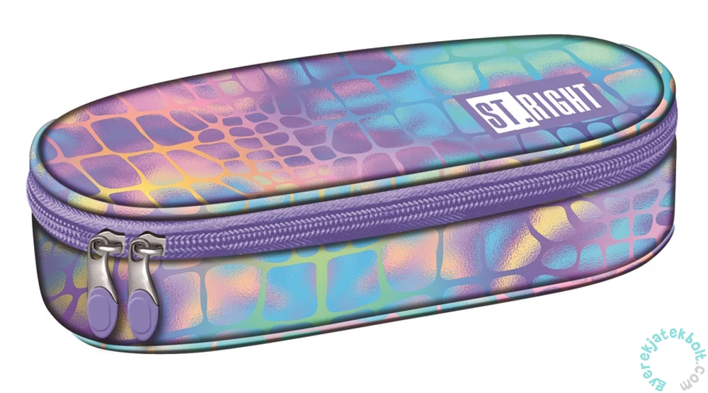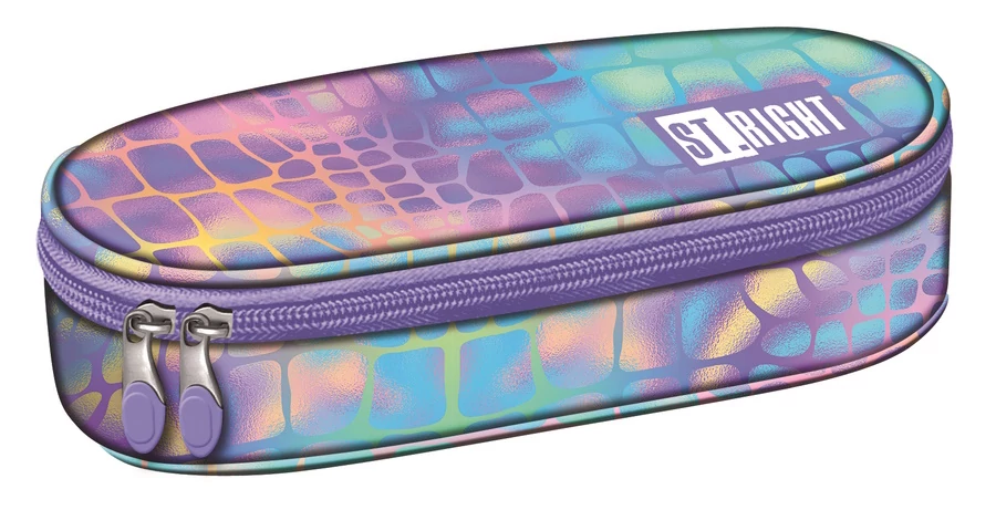 St.Right - Pastel Snake ovális tolltartó színes hologramos szín összeállítással. Egyterű belsejében praktikus cipzáras zseb is található, így elfér benne az összes írószer, amire az iskolásoknak szüksége van
