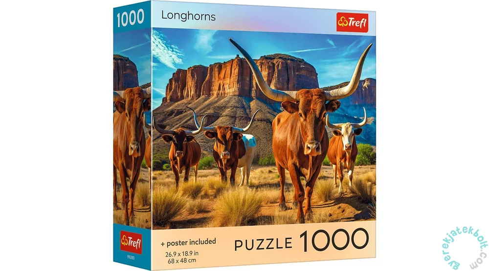 Csodáld meg a texasi hosszúszarvú marhák lélegzetelállító látványát! A Trefl 1000 db-os puzzle - Texasi hosszúszarvúak (99280) részletgazdagsága lenyűgöző,természetközeli élményt nyújt.
